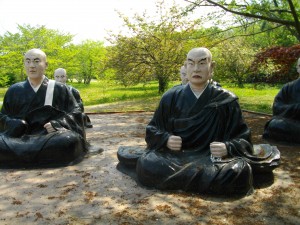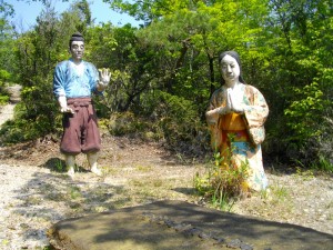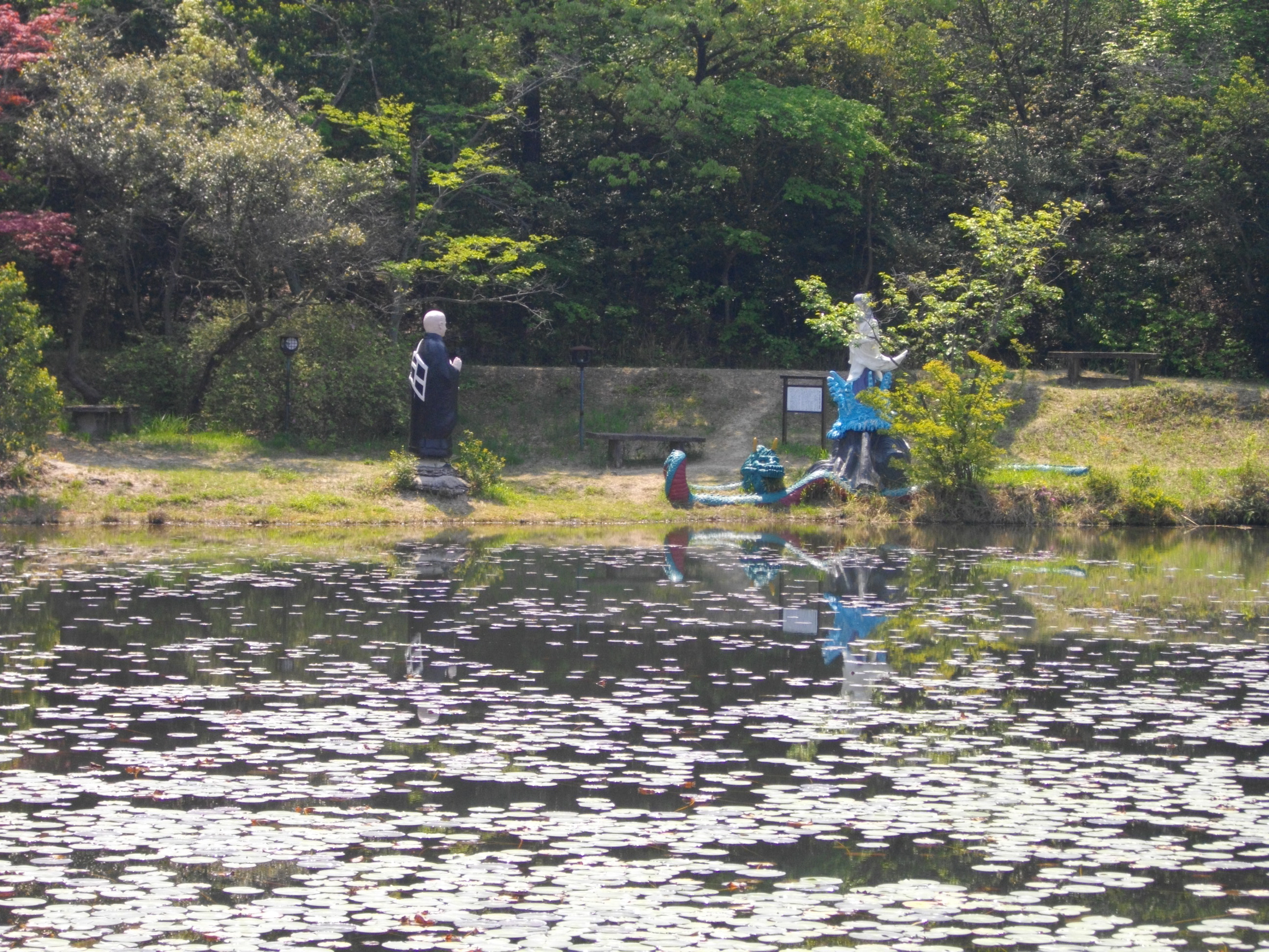 側には,浅野祥雲作と思われるコンクリート像がありますが,他のものより大きさが小さく,色が塗られておらず,説明文も一切ない。